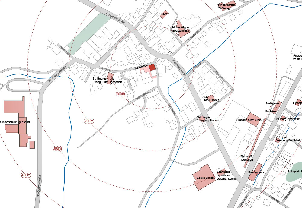 Das Mehrfamilienhaus Am Kirchplatz 1 befindet sich im historischen Ortskern von Igensdorf in Sichtweite zur St. Georgskirche und besticht durch eine außergewöhnlich ruhige Wohnlage mit Blick ins Grüne. Hinzukommend, erreicht man problemlos alle wichtigen Einrichtungen des täglichen Bedarfs in kürzester Zeit zu Fuß. So sind es nur wenige Schritte zum Igensdorfer Bahnhof oder dem Lebensmittelmarkt an der Forchheimer Straße.